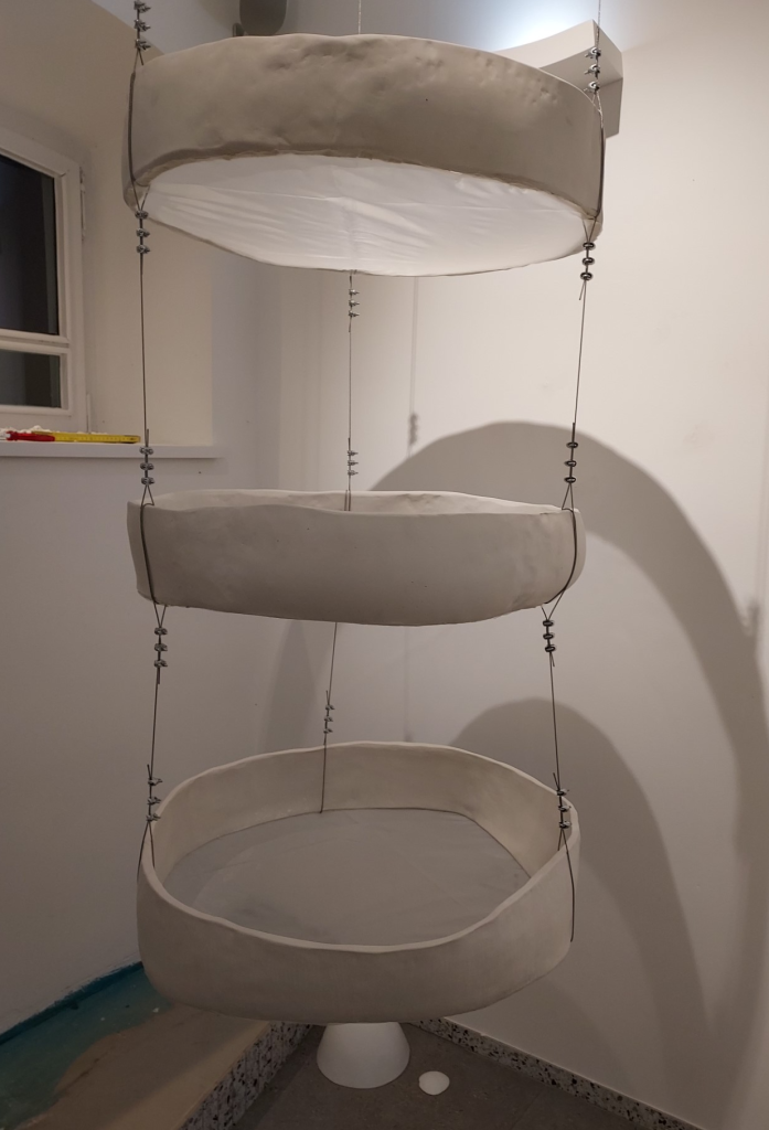 Koncept se ukvarja s sestavo porcelana in njegovim filtriranjem. Velikost delčkov porcelana, kar ga loči od glin je cca. 0,002 mm, uporabljeni filtri pa segajo od 0,001 mm do 0,0005, 0,0003 in 0,0002 mikrometra…Osnovna ideja je spoznavanje materiala, ki prehaja čez filtre velikih sit različnih velikosti, ki skozi spustijo vedno manjše delčke. Le te sem spustila na papir, hkrati pa žgala. Porcelan želim ujeti v njegovi snovnosti, hkrati pa ga redčiti, ko material izgine. Končna ideja je priti do faze, ko material izgine – nekakšna dematerializacija.